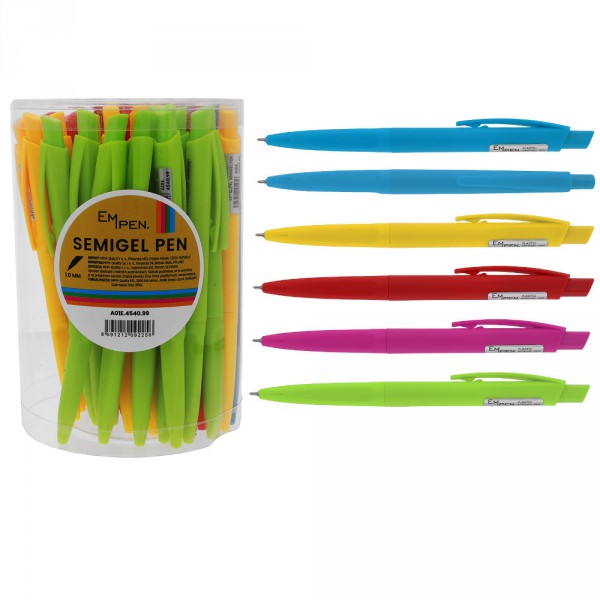Modern műanyag golyóstoll, semi gél betéttel, ergonomikus markolattal és nyomógombos mechanizmussal. Írásvastagsága 1 mm. 50db/csg vegyes színű tolltest.
