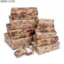 Kemény kartonból készült téglalap alakú díszdoboz különféle mintákkal 10 db egymásba rakható.Szettben áruljuk. Méretei: 1db: 8,5 x 6 x 2,8 cm, 1db: 10,5 x 7,6 x 3,2 cm. 1db 12,6 x 8,6 x 3,6 cm. 1db 14,6 x 9,6 x 4,2 cm. 1db 16,7 x 10,7 x 4,8 cm. 1db 18,6 x 11,7 x 5,3 cm. 1db 20,7 x 12,7 x 5,7 cm. 1db 22,4 x 14,4 x 6,3 cm. 1db 24,5 x 16,5 x 6,6 cm. 1db 26,4 x 17,6 x 7,3 cm.