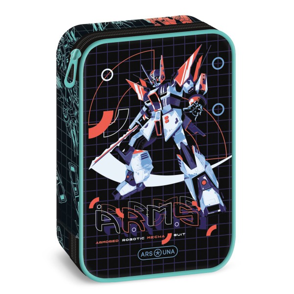 Többszintes, töltetlen, cipzáras tolltartó. Belül textillel bevont merev lapokkal, gumis kialakítással az írószerek tárolásához. Ceruzatartók: 30 db. Radírtartó: 4 db. Extra: plusz zseb további írószereknek. Méret: 155 x 225 x 45 mm.