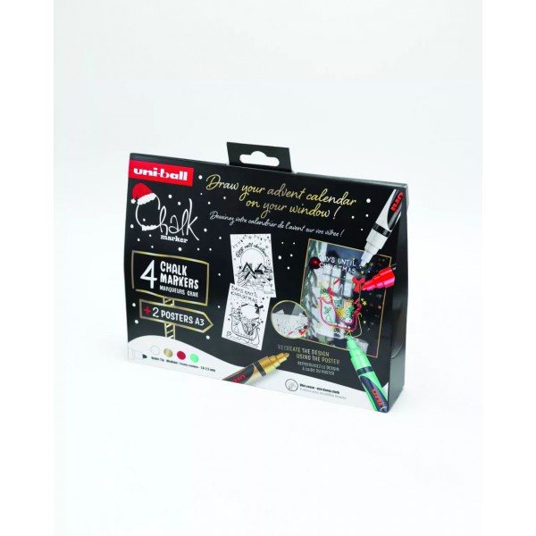 Folyékony krétamarker készlet dekorálásra. A tradicionális készlet tartalma: 1-1 db arany, fehér, piros, metál zöld UNI PWE-5M krétamarker. 2 db A/3-as méretű karácsonyi sablon. Hegyvastagság: 1,8 - 2,5 mm.Kerek hegy, víz alapú tinta.