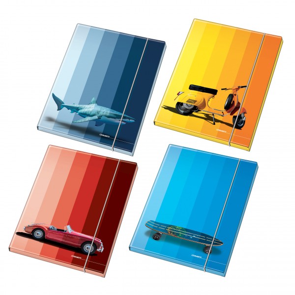 A/4 karton gumis mappa 4féle mintával vegyesen csomagolva. Mérete: 26 x 35 x 1,2cm.