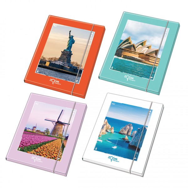 A/4 karton gumis mappa 4féle tájképes mintával mintával, vegyesen csomagolva. Mérete: 26 x 35 x 1,2cm.
