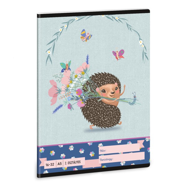 A/5-ös méretű, vonalas füzet 2. osztályos szabványos vonalazással. 32 lapos, belseje 75 gr-os papírból. Borítója 250 gr-os műnyomó kartonra lekerekített sarkokkal, fényes fóliázással, 4 szín nyomással készült.