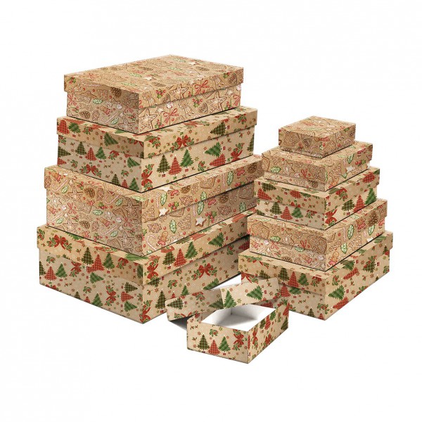 Kemény kartonból készült téglalap alakú díszdoboz különféle mintákkal 10 db egymásba rakható.Szettben áruljuk. Méretei: 1db: 8,5 x 6 x 2,8 cm, 1db: 10,5 x 7,6 x 3,2 cm. 1db 12,6 x 8,6 x 3,6 cm. 1db 14,6 x 9,6 x 4,2 cm. 1db 16,7 x 10,7 x 4,8 cm. 1db 18,6 x 11,7 x 5,3 cm. 1db 20,7 x 12,7 x 5,7 cm. 1db 22,4 x 14,4 x 6,3 cm. 1db 24,5 x 16,5 x 6,6 cm. 1db 26,4 x 17,6 x 7,3 cm.
