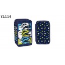 3 emeletes töltött tolltartó. Tartalma: 16 színes ceruza, 16 filctoll, 3 grafit ceruza, radír, olló, vonalzó, órarend. Mérete: 20 x 14 x 6,5 cm.