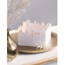 4 részből álló papír vilagító falu szett. Vastag kartonból készül 350 g/ m2, melybe elektromos teamécses tehető. Tartalma: előre vágott ház formák, kétoldalas ragasztószalag, elemes teamécses. A házak magassága kb 130 mm.