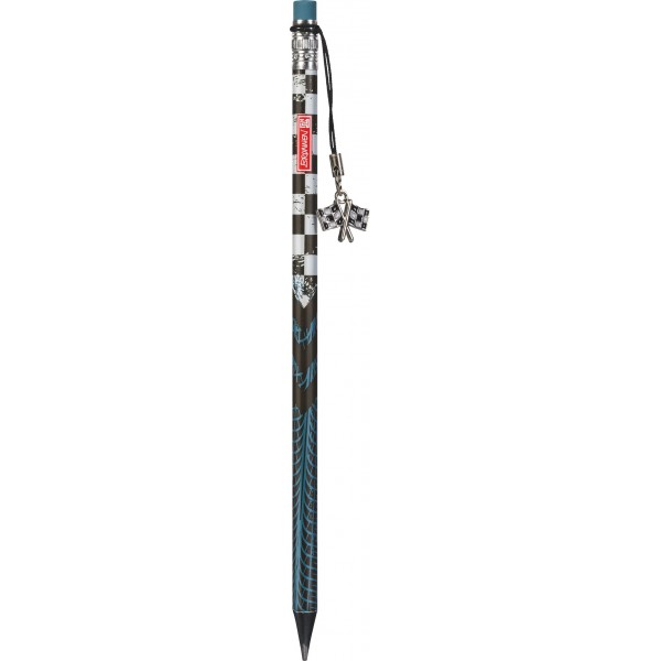 Grafit ceruza radírral a végén HB kerek, mintás testtel, a végén fém versenyzászló alakú dísszel.