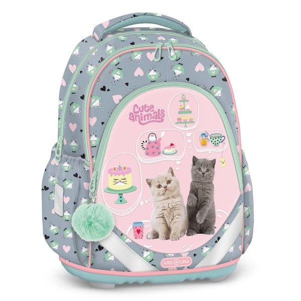• Hátizsák formájú iskolatáska, amely ideális kisiskolásoknak. Ergonómikus kialakítású, vízlepergető anyagból készült, szellőztető barázdákkal teli és műanyag merevítésű hátkiképzéssel. Puha, méretre állítható vállpántokkal, amelyekekkel szabályozható, hogy mennyire álljon feszesen a gyerek hátához simulva a táska. A hátizsák három nagy cipzáras rekesszel rendelkezik,az elsőben a táska mintájával megegyező órarend található műanyag tartóban. Oldalán két gumis zsebbel a kulacs részére. Alja megerősített textilből készült. Fényvisszaverő elemekkel elől és a vállpántokon. Tetején fogantyúval. Mérete: 340 x 400 x 210 mm. Súlya: 0,75 kg. Táska űrtartalma: 24 l. Terhelhetőség: 10 kg-ig. 3 év garancia.