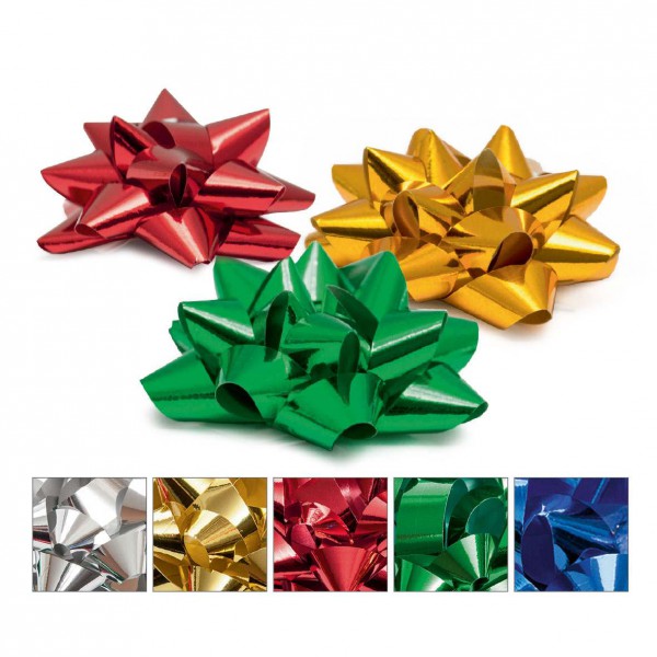 Metálfényű 65 mm átmérőjű masni. Egy dobozban 80db található vegyes színekben. Zöld, magenta, arany, pink, bronz, ezüst.