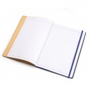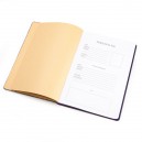 Napló keményfedeles, oldalán gumi pánttal záródik. 96 lapos vonalas belső. Mérete: 17,6 x 25 cm