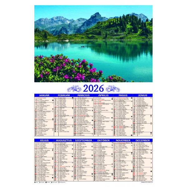 Plakátnaptár A/2 méretben névnapokkal, színes fényképpel.